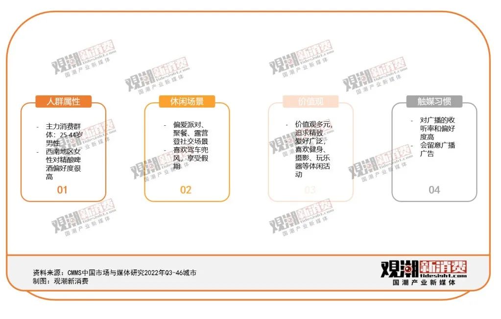根據(jù)GSI增長(zhǎng)策略研究院調(diào)研分析3萬多位精釀啤酒消費(fèi)者所得到的數(shù)據(jù)來看,25-44歲男性為主力消費(fèi)群體,精釀飲用者中男性占比更高,且學(xué)歷收入更高;此外,西南地區(qū)的女性對(duì)精釀啤酒偏好度很高,她們熱愛社交、愛好廣泛、價(jià)值觀多元。