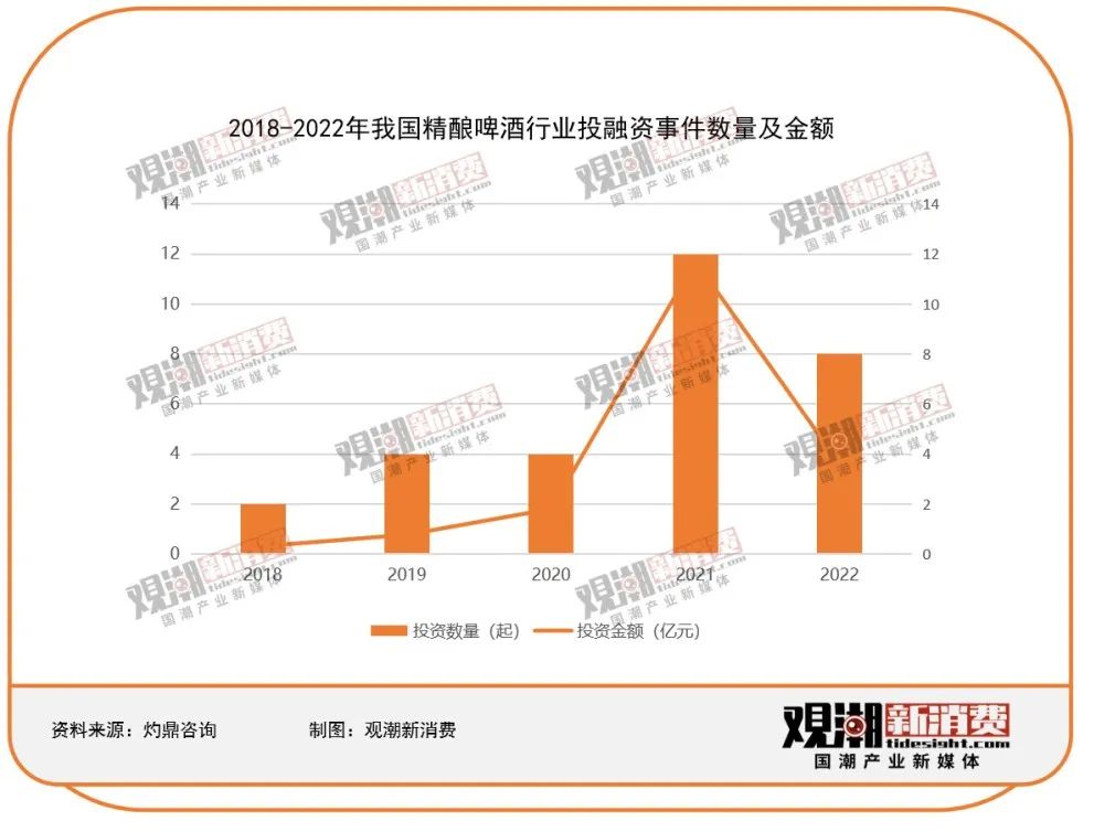 首要方面是資本聚焦所引導(dǎo)的催化。從2013年開始,精釀啤酒持續(xù)受到資本關(guān)注:頭部獨(dú)立精釀廠商在資本的助推下開始連鎖運(yùn)營(yíng),生產(chǎn)灌裝/瓶裝啤酒,發(fā)展線上銷路。根據(jù)灼鼎咨詢統(tǒng)計(jì),僅在2021年精釀啤酒品牌融資就超過10億元,投融資數(shù)量也在同時(shí)達(dá)到頂峰。