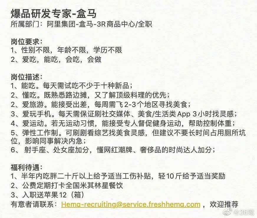 3年前,盒馬因?yàn)楸费邪l(fā)專(zhuān)家的崗位介紹“主要要求是能吃、愛(ài)吃”羨煞了許多網(wǎng)友,“B站美食區(qū)3小時(shí)起,我不怕吃出工傷。”