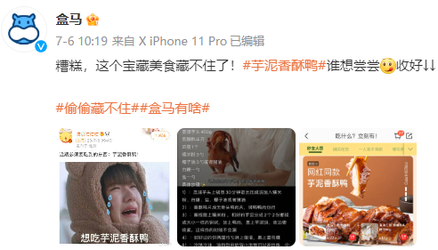 前一秒在美食博主視頻里看到的“復(fù)刻網(wǎng)紅食品XX”,下一秒逛盒馬就能看到安全版貴替。比如上個(gè)月席卷小紅書(shū)的茉莉冰豆?jié){,在趙露思電視劇走紅的芋泥香酥鴨,以及年初流行的糯嘰嘰蘸醬麻薯。