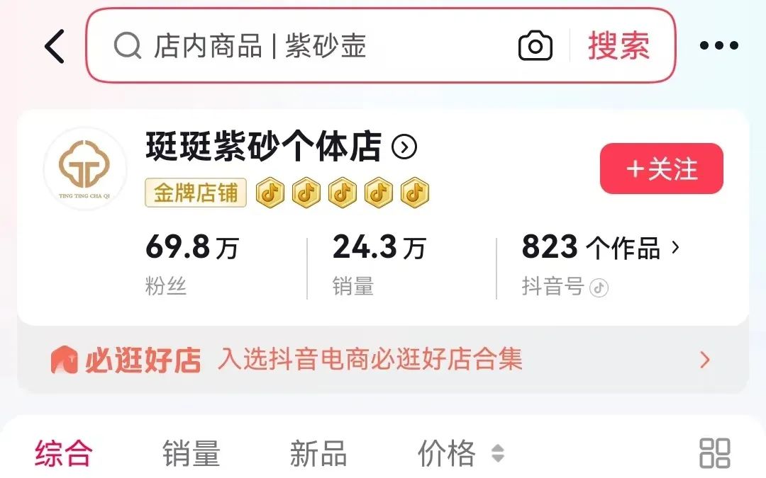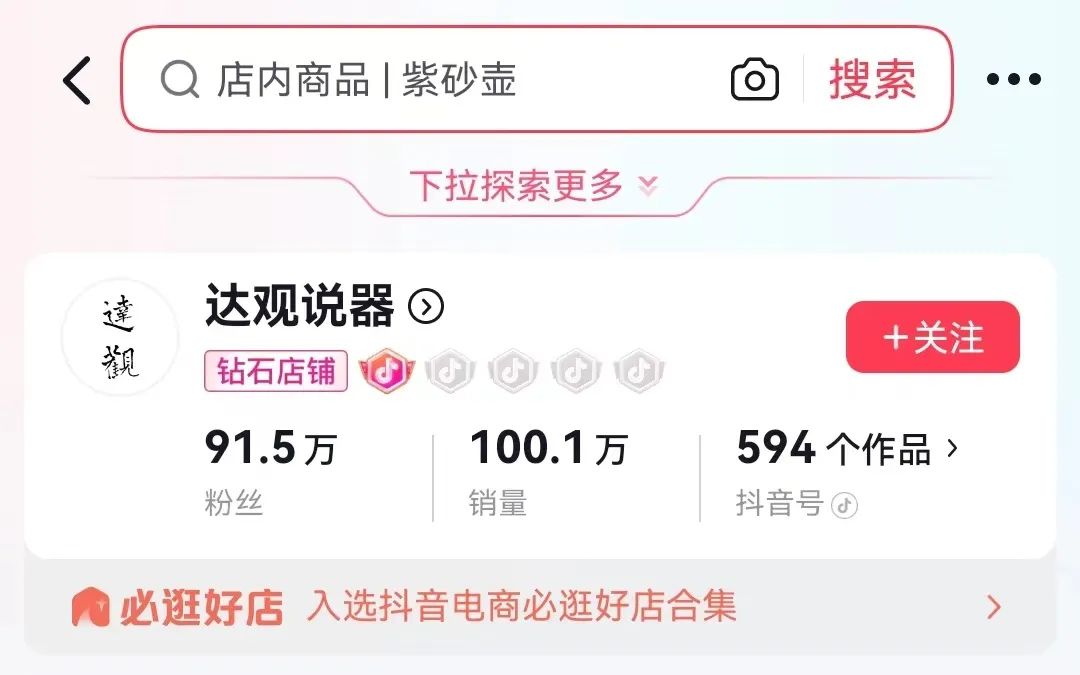 交易額飆升背后,商家正在瘋狂涌入。被抖音電商扶持前,入駐抖音的紫砂壺商家不過百位;一年后,入駐商家超過4400家。截至今年7月底,入駐商家已超過8000家,幾乎是三年前的80多倍,還涌現(xiàn)出一批年銷售額過億的頭部賣家,比如達(dá)觀說器、珽珽紫砂。業(yè)內(nèi)人士告訴億邦動力,今年以來銷售額近億元的商家有近十家。