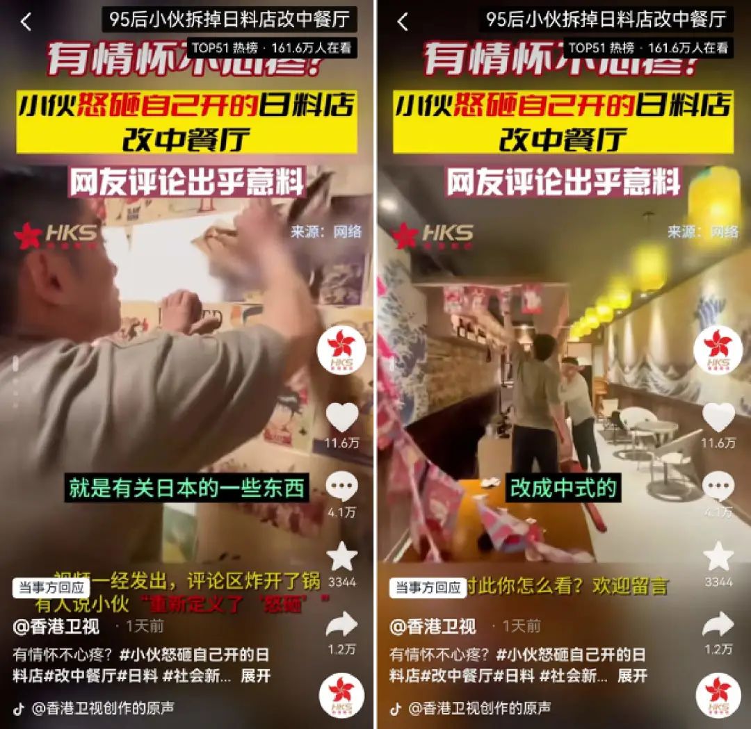 》激進(jìn)派:貴州日料店老板“怒砸店”,要將其改成中餐廳。這一視頻被傳播到網(wǎng)上后,引發(fā)了不小的關(guān)注。隨后,這一老板被質(zhì)疑炒作賺取流量,而本人回應(yīng)——自己發(fā)視頻,一是因?yàn)槊褡迩榻Y(jié)比較氣憤,表達(dá)憤怒情緒,二是告訴顧客店面準(zhǔn)備轉(zhuǎn)型,“只是將墻紙和燈籠等撕毀,希望大家不要盲目效仿”。