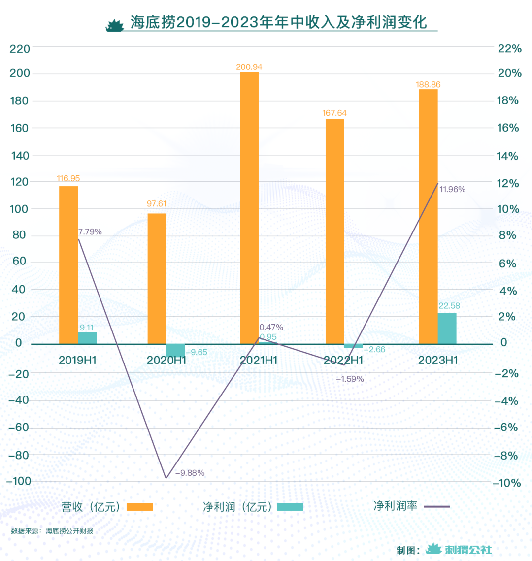 8月29日晚,海底撈發(fā)布2023年上半年業(yè)績報告,交上了一份亮眼的成績單。財報顯示,海底撈在2023年上半年營收188.86億元,同比增長24.6%;凈利潤達到22.58億元,同比增長945.19%,創(chuàng)造了歷年中報的最佳業(yè)績,甚至接近2019年全年的凈利潤。而在去年此時,海底撈還處在凈虧損2.66億元的泥潭之中。