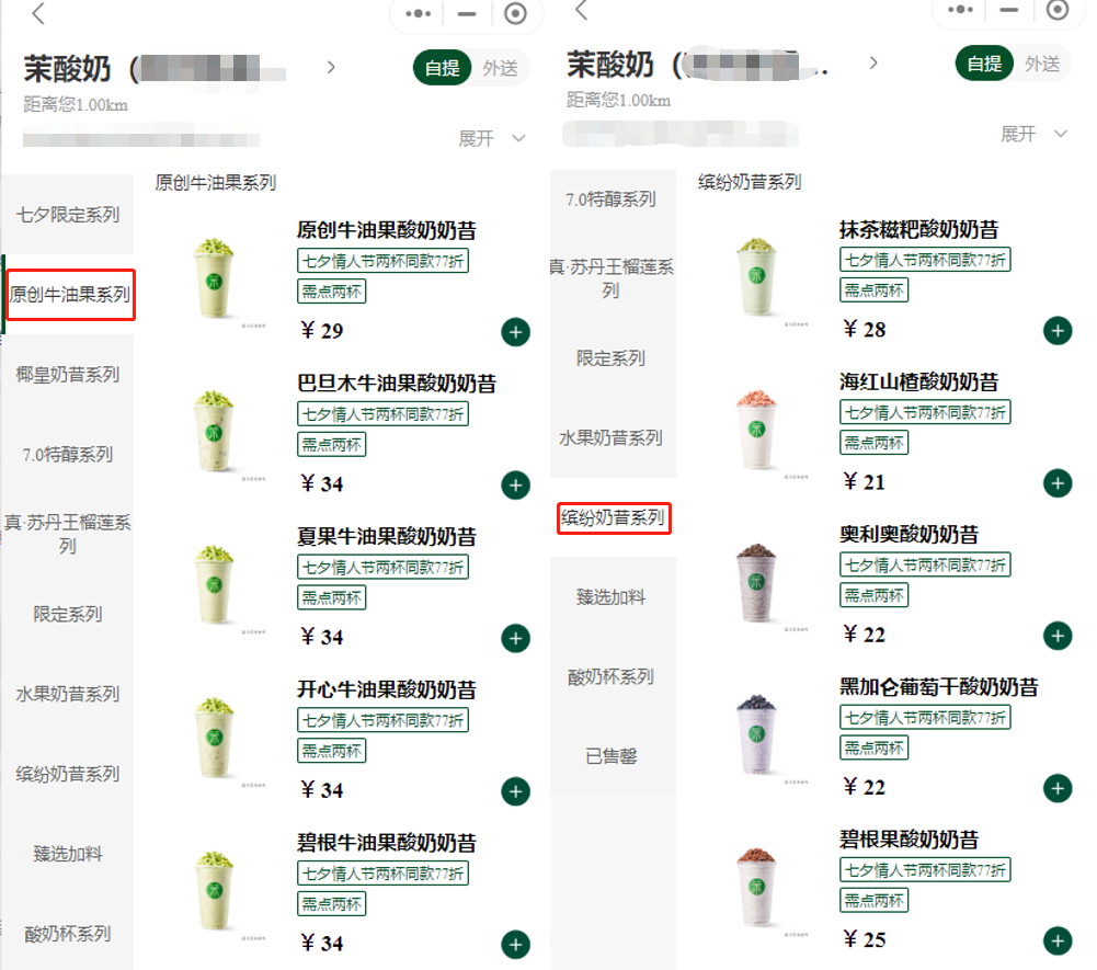 茉酸奶目前主要分布在一線、新一線城市,主打“一杯奶昔等于一顆牛油果”的心智。與同時(shí)包含酸奶、果茶、奶茶等多品類的現(xiàn)制酸奶店不同,茉酸奶的產(chǎn)品結(jié)構(gòu)較簡(jiǎn)單,主推酸奶奶昔和酸奶系列?谖渡戏譃檎信朴凸推渌叨说乃,通過添加堅(jiān)果或甜品小料來(lái)豐富SKU。