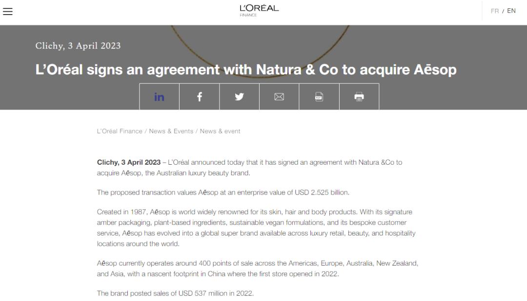 2023年4月3日,歷經(jīng)近半年的“爭(zhēng)奪”后,伊索最終花落歐萊雅集團(tuán)。4月4日,歐萊雅集團(tuán)發(fā)布消息表示,其已與伊索母公司Natura&Co簽署收購(gòu)伊索品牌的協(xié)議,對(duì)該品牌的估值為25.25億美元(約合人民幣184億元)。