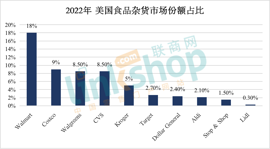然而,在美國,兩者差距甚遠。自1976年進入美國市場以來,ALDI從競爭激烈、碎片化嚴重的市場中站穩(wěn)腳跟。數(shù)據(jù)顯示,其2022年銷售額約為270億美元,占食品雜貨零售市場份額的2.1%。