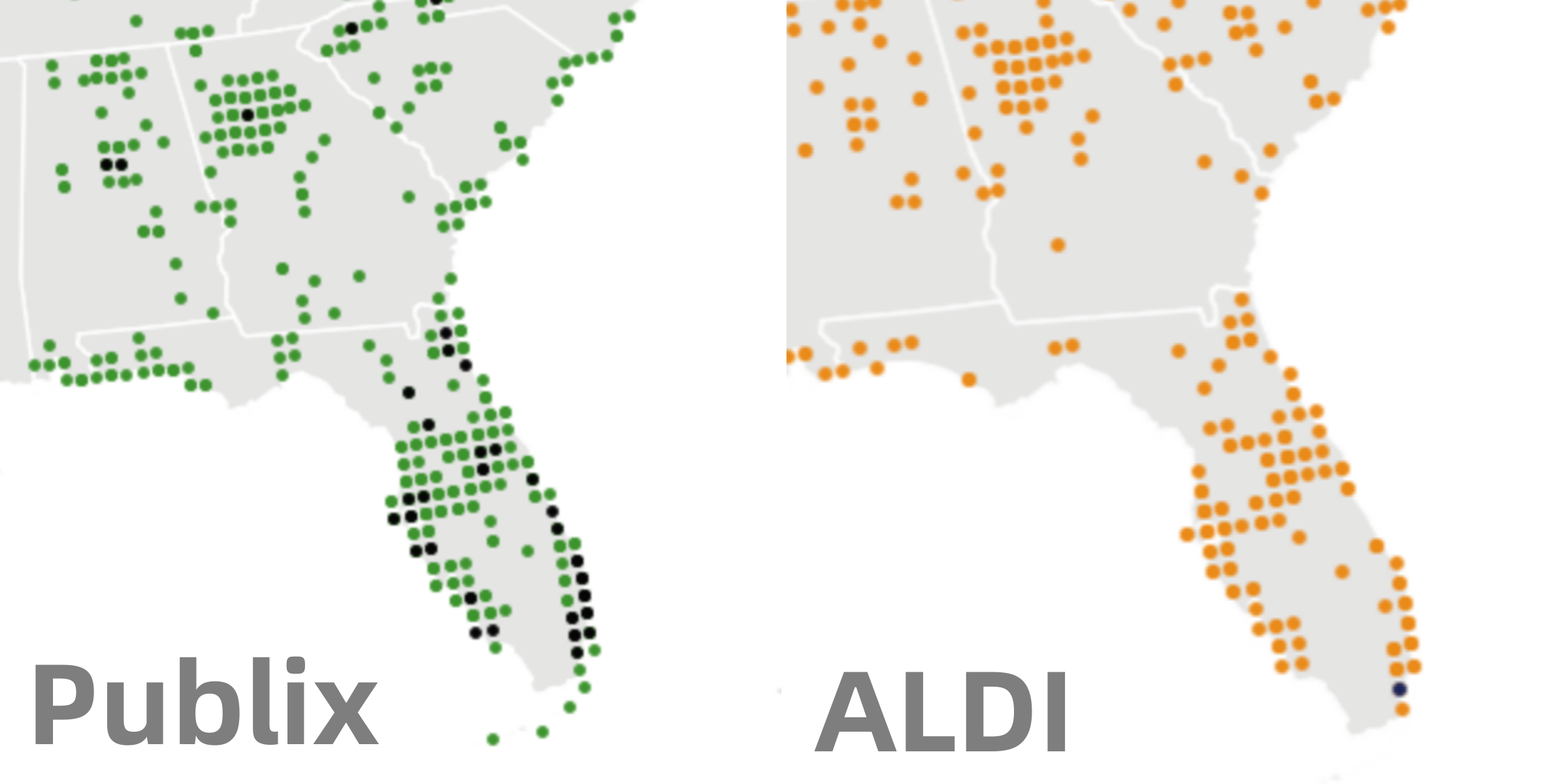 再來看看當?shù)氐陌灾鱌ublix超市。該品牌在佛羅里達州密集分布,平均每2.5萬名居民所在地就有一家門店,而ALDI在收購前的這個數(shù)據(jù)為10萬人,兩者之間的分布密度相差近4倍。