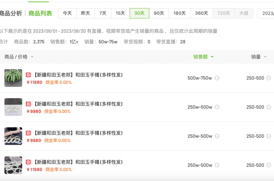 這些真實的“原始”操作反而更易獲得中老年女性的信任,雖然老鄭給自己立的人設(shè)是把玉石做到平民價,短視頻也多用幾十塊錢的玉來引流,但飛瓜數(shù)據(jù)顯示,近一個月,銷售額最高的商品為售價1198元的和田玉青圓條手鐲(多樣性發(fā)),直播銷量200-500個,銷售額為750W。