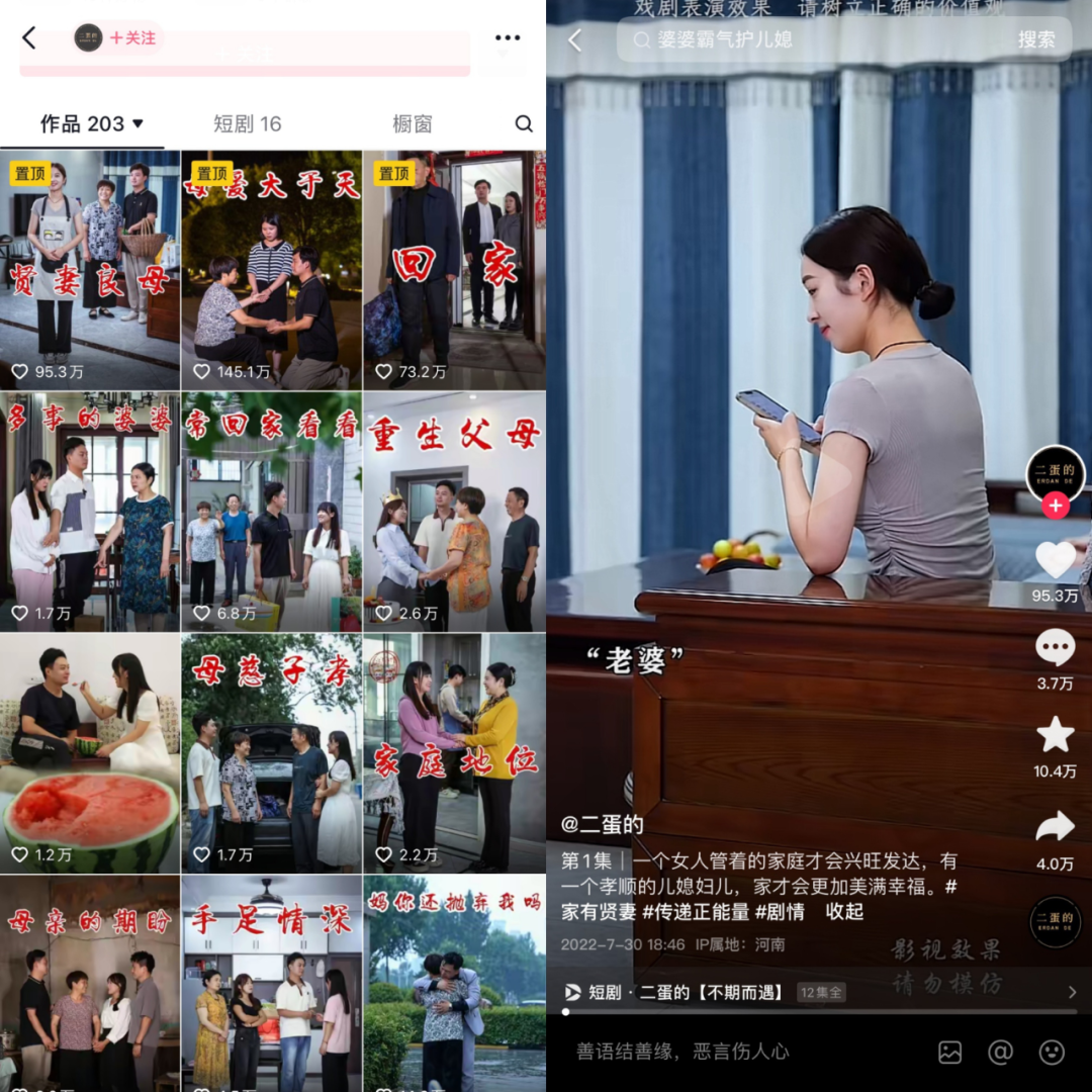 最重要的是“正能量”,通過這類內(nèi)容激起老年人的情緒波動,提供情緒價值。劇情達(dá)人“二蛋的”擁有1424萬粉絲,經(jīng)常拍攝關(guān)于“婆媳關(guān)系”“母愛”“手足”“鄰里關(guān)系”等短視頻,戳中一眾希望母慈子孝、健康幸福的中老年的價值觀以及不想成為子女家人負(fù)擔(dān)的危機感,正如吐槽快餐愛情、抱怨原聲家庭的爆款短視頻是吸引年輕人的流量密碼一樣。