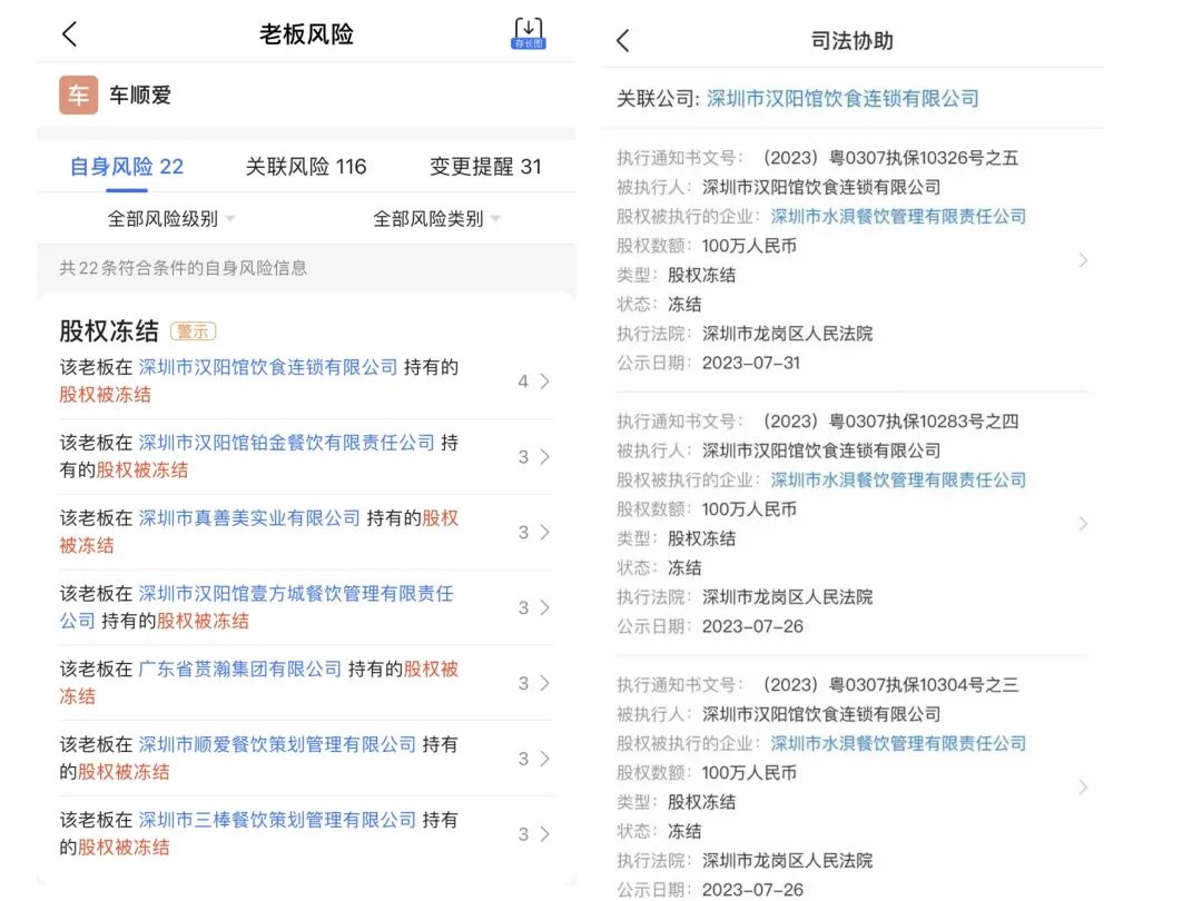 并于今年4月、8月,車順愛相關(guān)多家公司被寶安區(qū)人民法院強制執(zhí)行,執(zhí)行標(biāo)的分別為51.57萬及23.32萬。