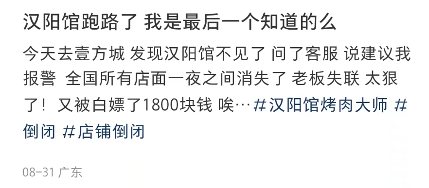 “今天去壹方城,發(fā)現(xiàn)漢陽館不見了,問了客服,說建議我報警,全國所有門店一夜之間消失了,老板失聯(lián),太狠了!又被白嫖了1800塊錢!