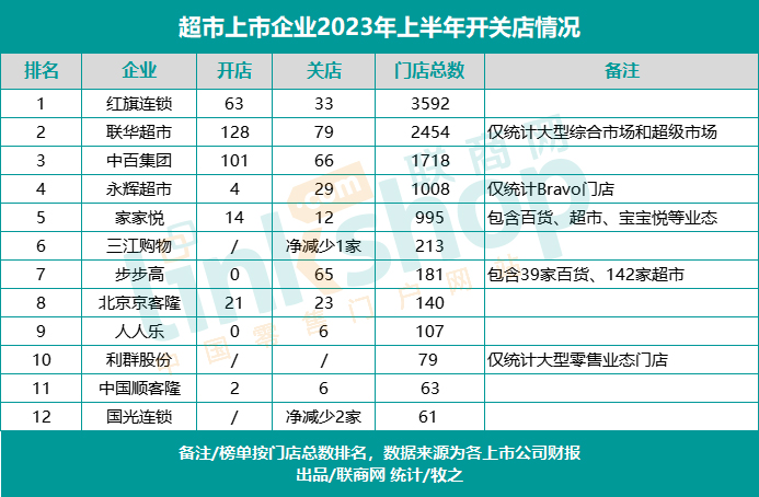 據(jù)聯(lián)商網(wǎng)零售研究中心統(tǒng)計(jì),2023年上半年,12家超市上市企業(yè)新開333家門店,關(guān)閉了322家門店。(注:部分企業(yè)只統(tǒng)計(jì)大賣場、綜合超市等大型門店)