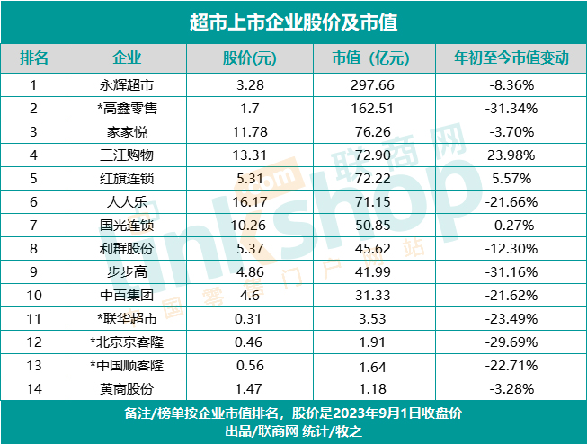 單從企業(yè)市值角度來看,超過百億的只有兩家:永輝超市297.66億元,高鑫零售162.51億元;50-100億元之間的有5家,分別是家家悅、三江購物、紅旗連鎖、人人樂和國光連鎖;10-50億元之間的有3家,分別是利群股份、步步高和中百集團(tuán);聯(lián)華超市、北京京客隆、中國順客隆、黃商股份等4家企業(yè)市值低于5億元。