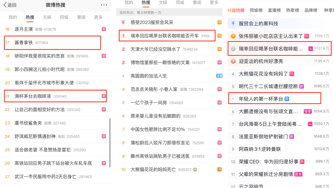 社交平臺上,這件事也引發(fā)了大面積的討論,微博和抖音上一度霸榜,#醬香拿鐵#、#年輕人第一杯茅臺#等多個相關(guān)詞共登上5次微博熱搜榜單,#瑞幸回應喝茅臺聯(lián)名咖啡能否開車#還成為了微博熱搜TOP1。