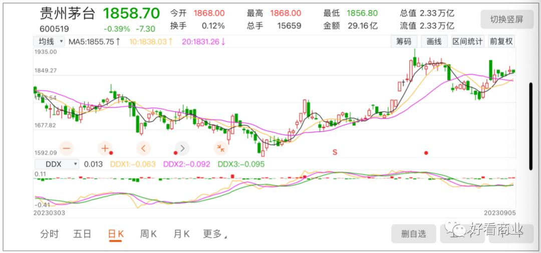 同一天,貴州茅臺以1868元開盤,但很快高開低走,盤中最低跌至1856.8元,最終以0.39%的跌幅收盤。按照茅臺超2.3萬億的市值計,今日跌幅相當于市值蒸發(fā)100多億。