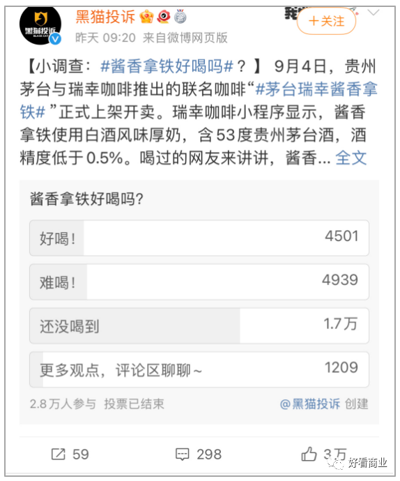 在一項題為“醬香拿鐵好喝嗎”的網(wǎng)絡小調(diào)查中,截至目前共有2.8萬人參與,4501人表示好喝,4939人選擇難喝,可以說好壞參半。