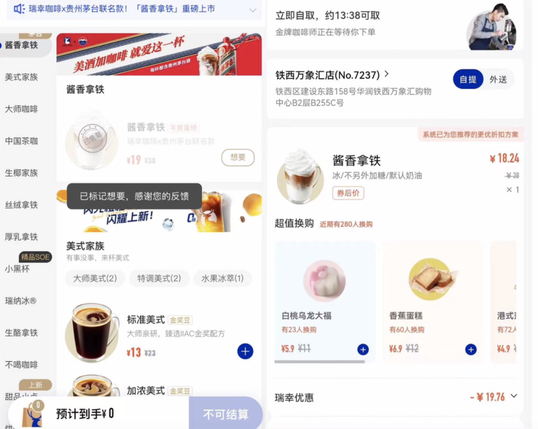 9月4日,瑞幸上線了和茅臺(tái)聯(lián)名推出的“醬香拿鐵”。相比滿街的“9.9元”咖啡,一杯醬香拿鐵折后也要19.9元,作為新品折扣力度并不十分驚人。
