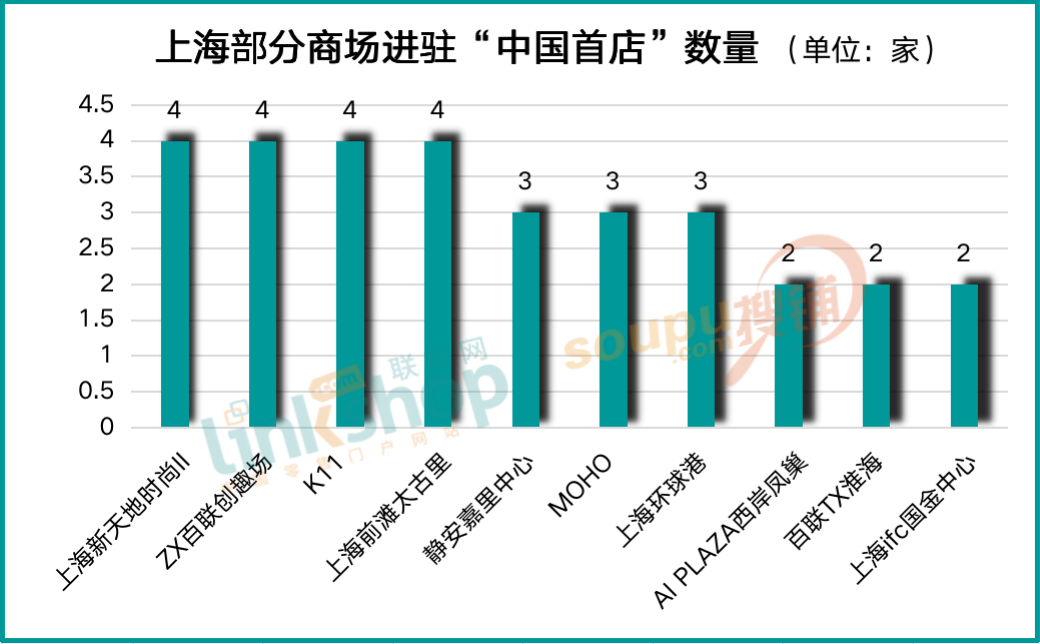 根據(jù)《聯(lián)商網(wǎng)》統(tǒng)計的數(shù)據(jù)來看,在商場分布上,上海新天地時尚II、ZX百聯(lián)創(chuàng)趣場、K11和上海前灘太古里并列第一,均新開4家“中國首店”,靜安嘉里中心、MOHO、上海環(huán)球港并列第二,均新開3家“中國首店”,AI PLAZA西岸鳳巢、百聯(lián)TX淮海、上海ifc國金中心并列第三,均新開2家“中國首店”。