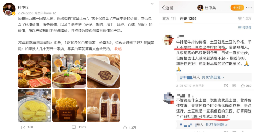 杜中兵那條“不漲價(jià)”微博下的高贊評(píng)論更是直接道出了消費(fèi)者內(nèi)心所真正介意的一點(diǎn):“牛排是牛排的價(jià)格,土豆是土豆的價(jià)格,千萬不要把土豆賣出牛排的價(jià)格”。