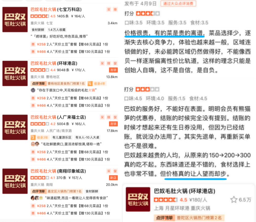 來自消費(fèi)者的真實(shí)評(píng)價(jià)也證明確實(shí)如此,大部分顯示人均消費(fèi)200元以上,并且抱怨“貴又吃不飽”“除了毛肚大部分菜品平平無奇”等。