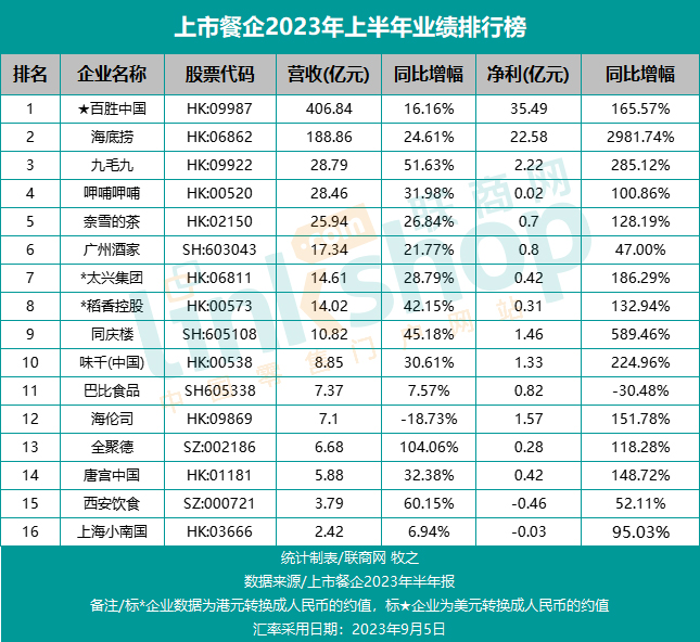 據(jù)聯(lián)商網(wǎng)零售研究中心統(tǒng)計,2023年上半年,16家上市餐企有14家實現(xiàn)營收、凈利同比大幅增長,沒有任何一家企業(yè)同時出現(xiàn)營收、凈利同比下滑。