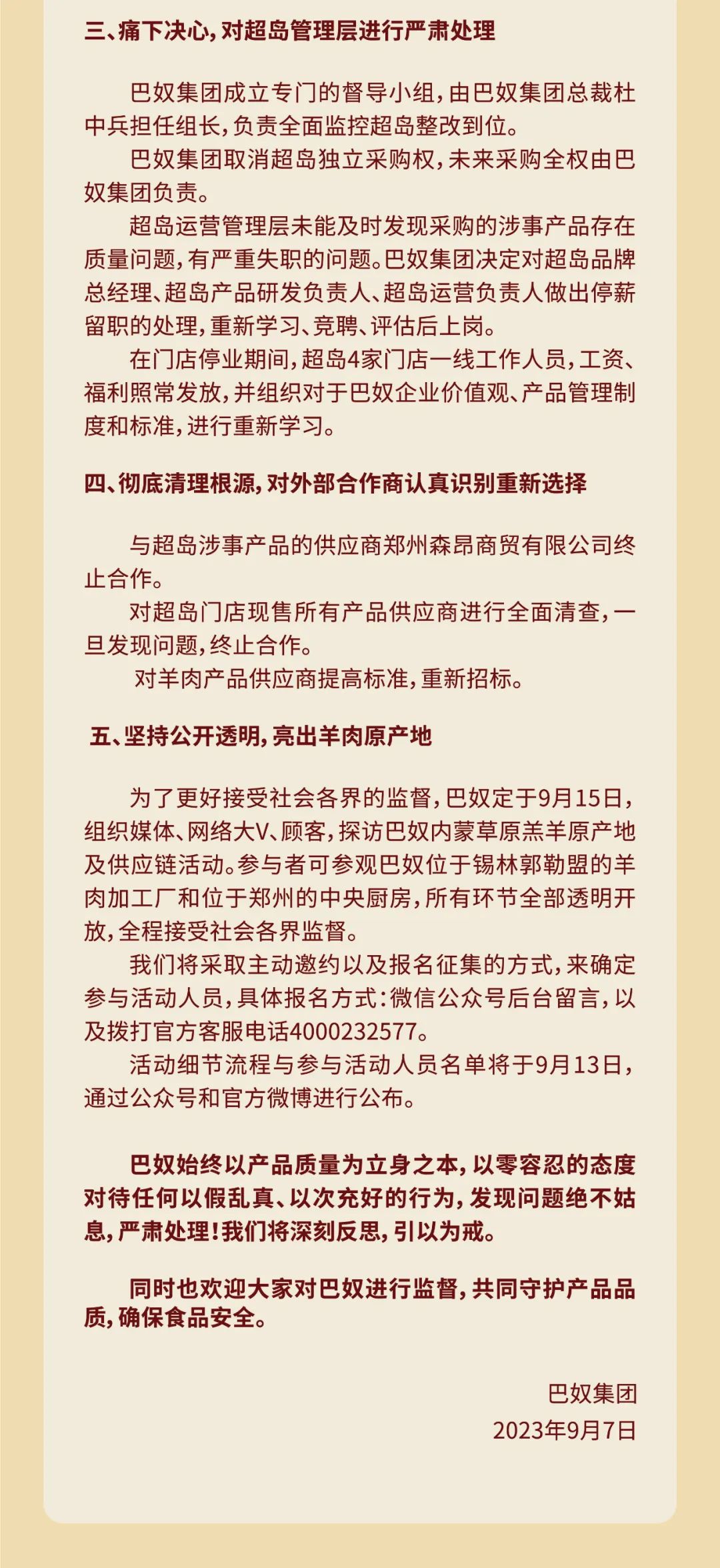 五、堅持公開透明,亮出羊肉原產(chǎn)地。為了更好接受社會各界的監(jiān)督,巴奴定于9月15日,組織媒體、網(wǎng)絡(luò)大V、顧客,探訪巴奴內(nèi)蒙草原羔羊原產(chǎn)地及供應(yīng)鏈活動。參與者可參觀巴奴位于錫林郭勒盟的羊肉加工廠和位于鄭州的中央廚房,所有環(huán)節(jié)全部透明開放,全程接受社會各界監(jiān)督。巴奴將采取主動邀約以及報名征集的方式,來確定參與活動人員。活動細(xì)節(jié)流程與參與活動人員名單將于9月13日,通過公眾號和官方微博進(jìn)行公布。