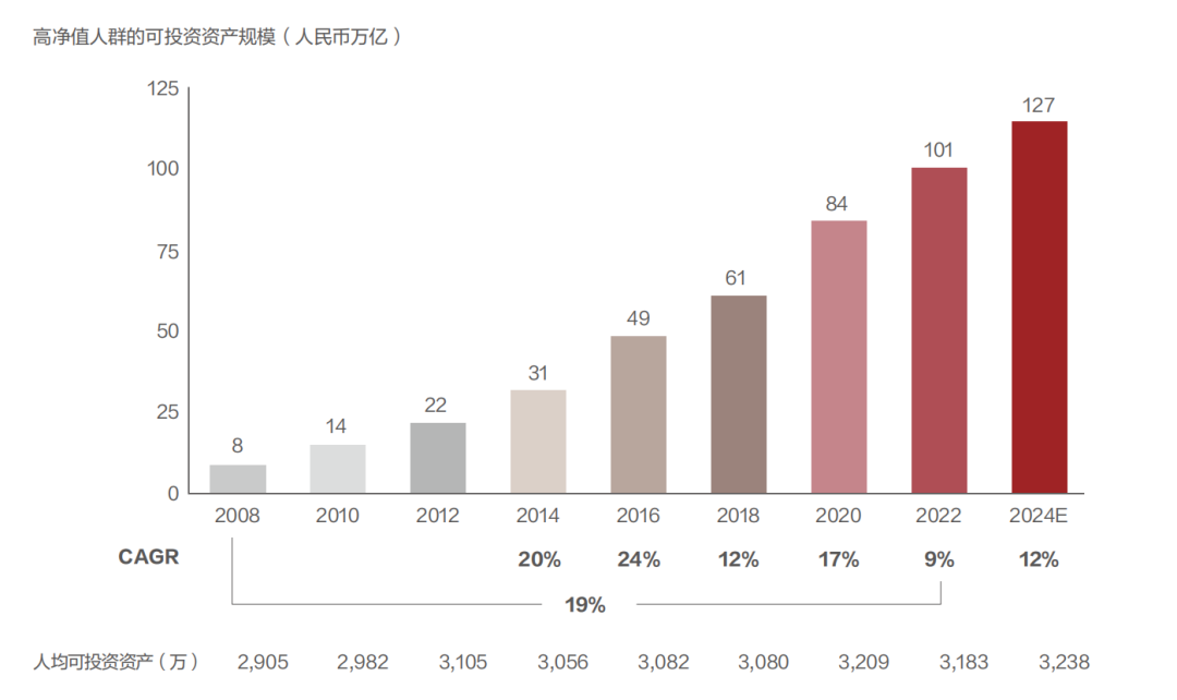 不過(guò),報(bào)告預(yù)計(jì),未來(lái)兩年,中國(guó)高凈值人群數(shù)量,以及持有可投資資產(chǎn)的規(guī)模,仍將以11%和12%的增速,繼續(xù)增長(zhǎng)。