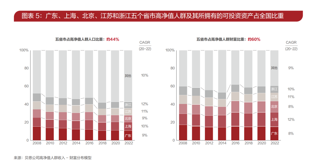 2022年,廣東、上海、北京、江蘇和浙江五個(gè)省市的高凈值人群人數(shù)占全國(guó)總數(shù)比例約為44%;其持有的可投資資產(chǎn)占全國(guó)高凈值人群財(cái)富比重約為60%。