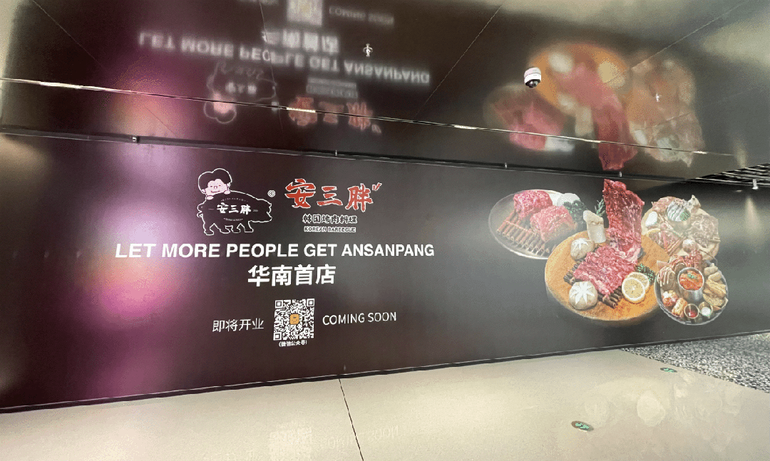 圍擋品牌分別為安三胖韓國(guó)料理(華南首店)、湘辣辣、渝月川(全國(guó)首店)、老船長(zhǎng)肉蟹煲、椰客·海南料理(全國(guó)首家)。