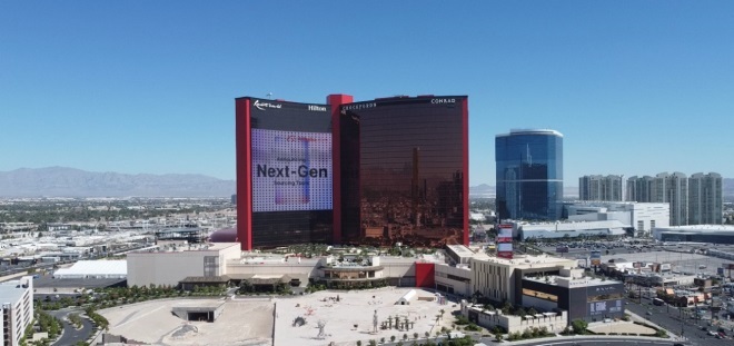 圖:美國拉斯維加斯的地標(biāo)建筑亮起了阿里國際站的介紹