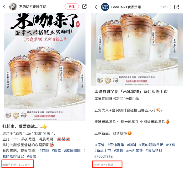 筆者以#庫迪咖啡米咖#、#庫迪咖啡 五常大米#為關(guān)鍵詞在小紅書上搜索發(fā)現(xiàn),一位名為@劉奶奶不愛喝牛奶的用戶于7日中午11時(shí)發(fā)布了庫迪新品米咖的相關(guān)信息,隨后行業(yè)新媒體跟進(jìn)并發(fā)布相關(guān)資訊。
