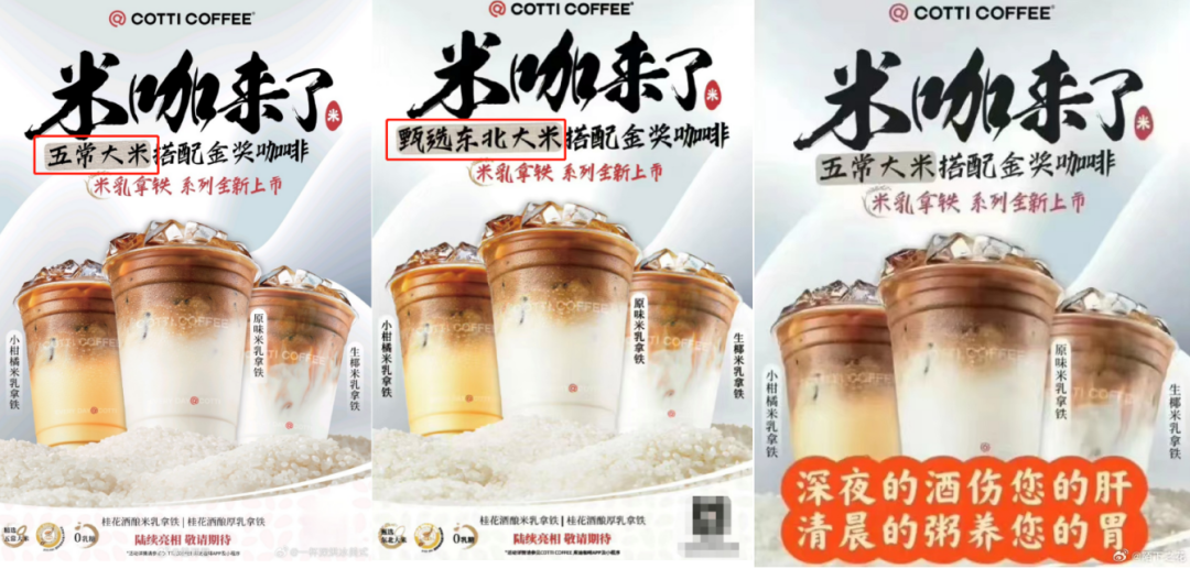 值得注意的是,網(wǎng)上流傳的新品海報(bào)明顯存在版本及宣傳語的不同,有的寫著“五常大米”,有的卻是“甄選東北大米”,還有的則附有那句極具挑釁意味的宣傳語:“深夜的酒傷您的肝,清晨的粥養(yǎng)您的胃”。