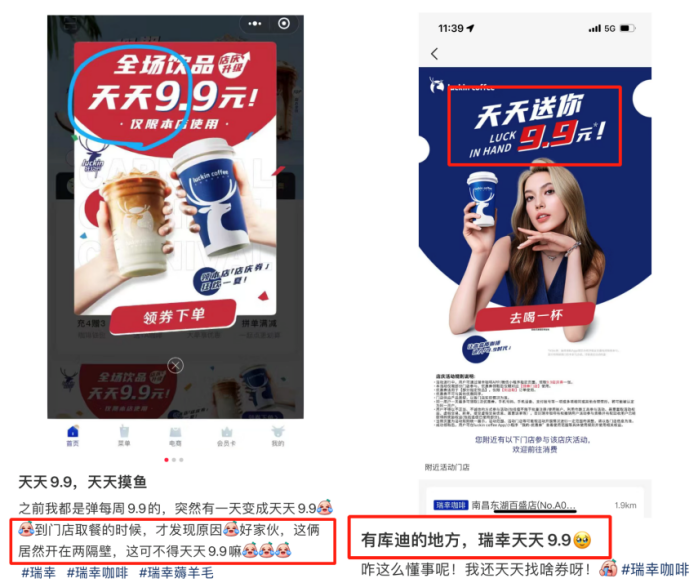 價(jià)格方面,憑借創(chuàng)建初期全場9.9元的營銷,庫迪收獲了一波流量。不過在門店數(shù)量初具規(guī)模后,庫迪在今年4月暫停了9.9元/杯的優(yōu)惠活動(dòng)。同一時(shí)期,瑞幸卻開始行動(dòng),開啟了“百城千店”、“每周都有9.9元”的店慶促銷,并表示該活動(dòng)將持續(xù)兩年。