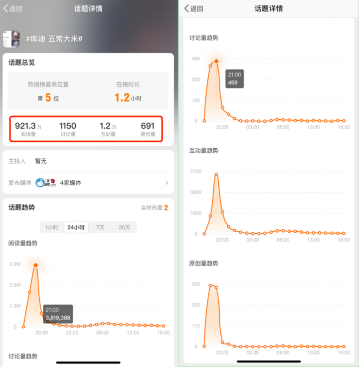 9月7日晚,一則#庫迪咖啡 五常大米#話題登榜微博熱搜第5。截至8日晚19:30,該話題閱讀量達(dá)921.9萬,藍(lán)鯨財(cái)經(jīng)、頭條新聞、西安網(wǎng)、西安廣播電視臺(tái)等主體參與了相關(guān)討論,總體討論量超1000條。
