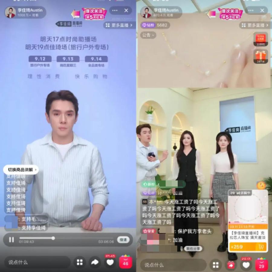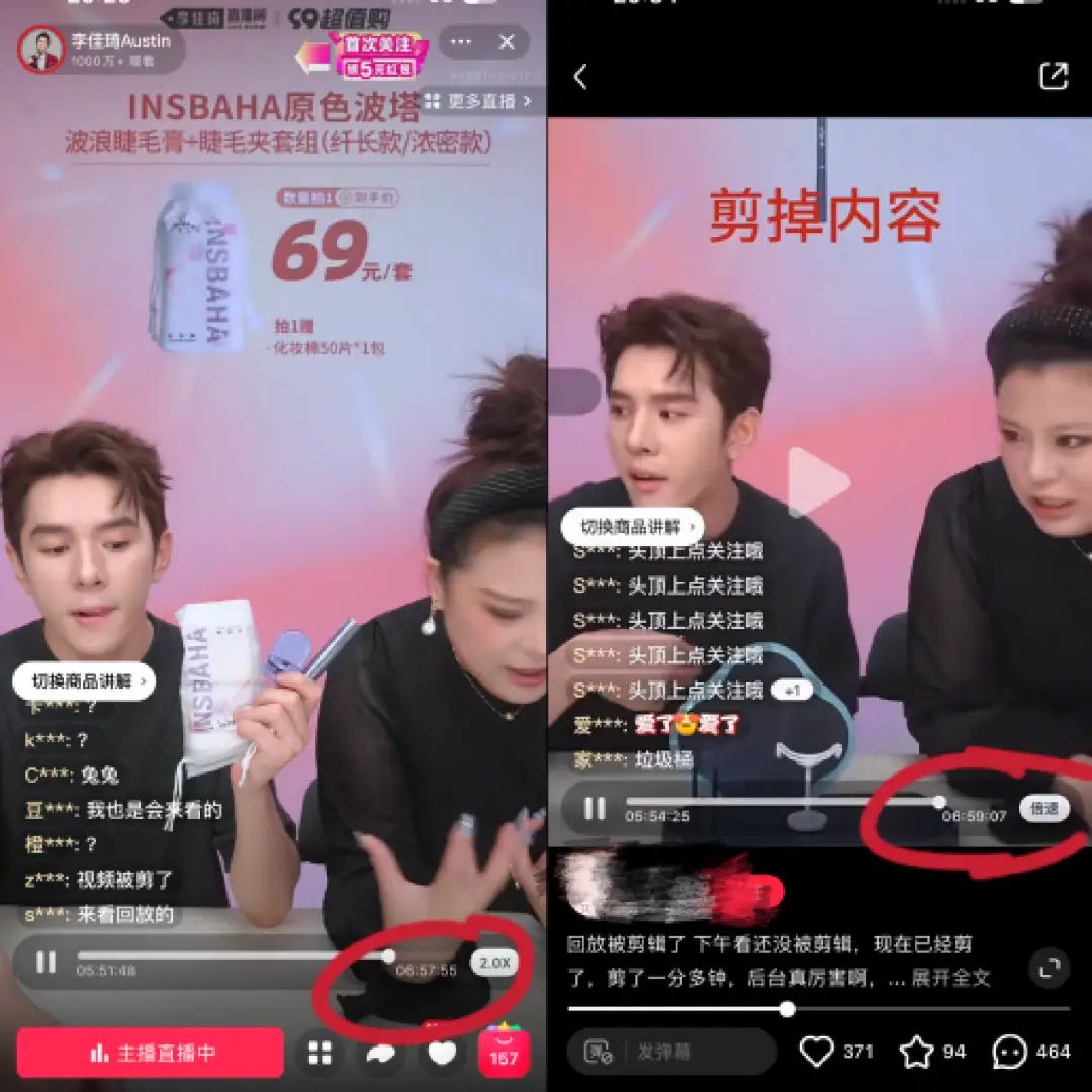 圖/李佳琦9月9日直播時(shí)長對比 左為“李佳琦直播間”回放,右為網(wǎng)友分享片段 來源/淘寶App、小紅書App燃次元截圖