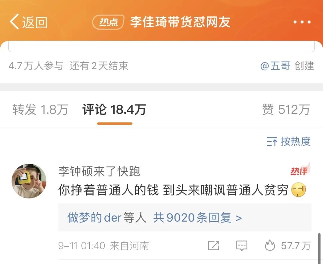 可事實(shí)上,李佳琦言論中透露出的傲慢,以至于充滿“何不吃肉糜”的意味,真能消除網(wǎng)友們的心頭質(zhì)疑嗎?網(wǎng)絡(luò)上有個評論點(diǎn)贊很高,或許能說明網(wǎng)友們的態(tài)度:“你掙著普通人的錢,到頭來嘲諷普通人貧窮!