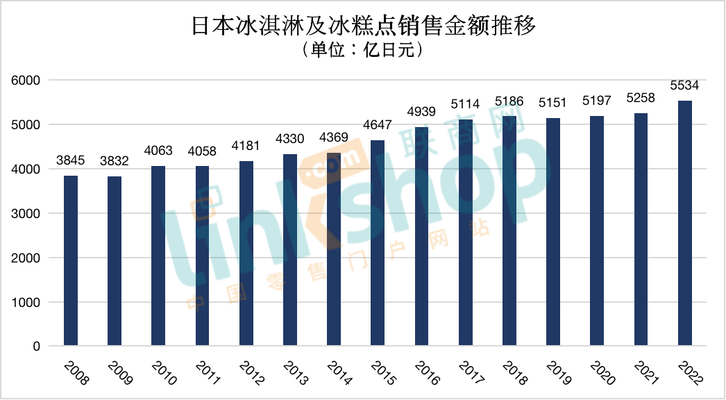 近年來,日本冰淇淋市場(chǎng)增長顯著。據(jù)日本冰淇淋協(xié)會(huì)發(fā)布的數(shù)據(jù),2022年度銷售額為(2022年4月1日至2023年3月31日)5534億日元(同比增長105.2%),創(chuàng)下歷史最高紀(jì)錄。順便一提,2013年度為4330億日元。