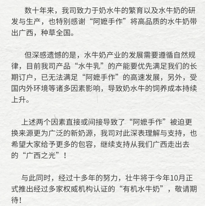 供應(yīng)商“壯牛水牛奶”發(fā)布的公告里就說了,目前產(chǎn)能要優(yōu)先供給長期訂戶,“已無法滿足‘阿嬤手作’的高速發(fā)展”。
