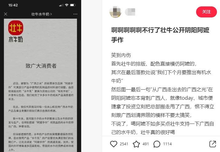 這一次不止是喜茶,阿嬤手作此前合作的供應(yīng)商“壯牛水牛奶”也發(fā)布了一則公告,先是解釋為何合作結(jié)束,再宣布將于10月推出經(jīng)權(quán)威認(rèn)證的“有機(jī)水牛奶”,被一些消費(fèi)者解讀為暗諷阿嬤手作:這么愛有機(jī),怎么不換成有機(jī)水牛奶?