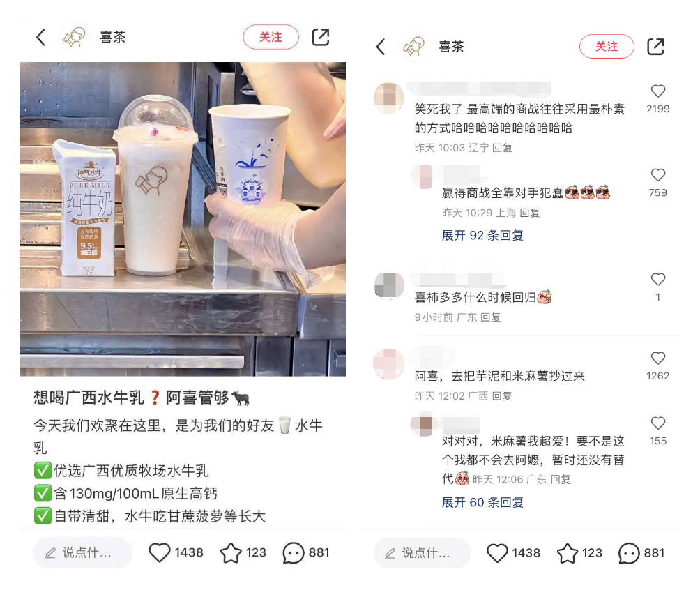 9月12日,喜茶發(fā)了一條小紅書:“想喝廣西水牛乳?阿喜管夠!笨此浦皇且粭l平平無奇的新品推廣,然而評(píng)論區(qū)皆擊節(jié)稱快,夸喜茶“有眼力見”“懂商戰(zhàn)”。