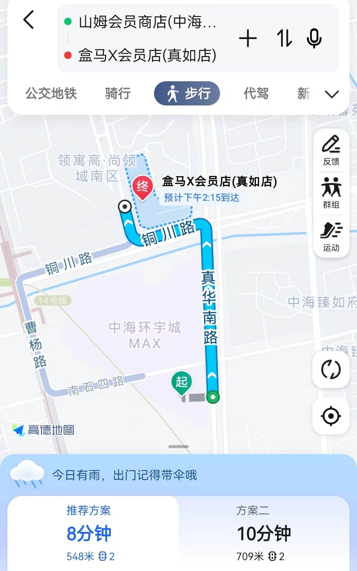 從地圖上可以看到,在這段步行距離僅500多米的道路兩端,分別坐落著盒馬X會(huì)員店和山姆會(huì)員店兩家門店。