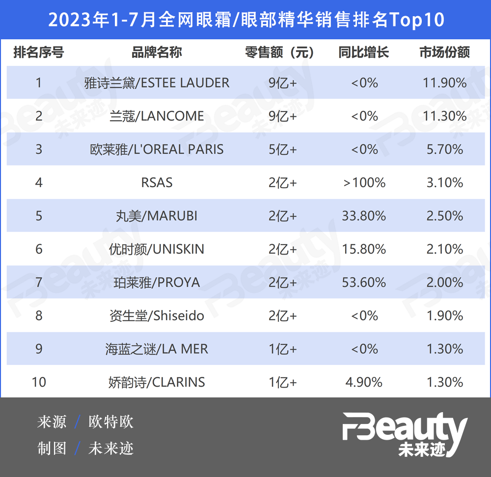 歐特歐國(guó)際咨詢最新數(shù)據(jù)顯示,2023年1月-7月全網(wǎng)眼霜/眼部精華銷售額top50品牌中,按照市場(chǎng)份額來看,排名三甲分別為雅詩(shī)蘭黛、蘭蔻、歐萊雅,其中雅詩(shī)蘭黛和蘭蔻零售額均突破了9億,其市占率分別為11.9%和11.3%。