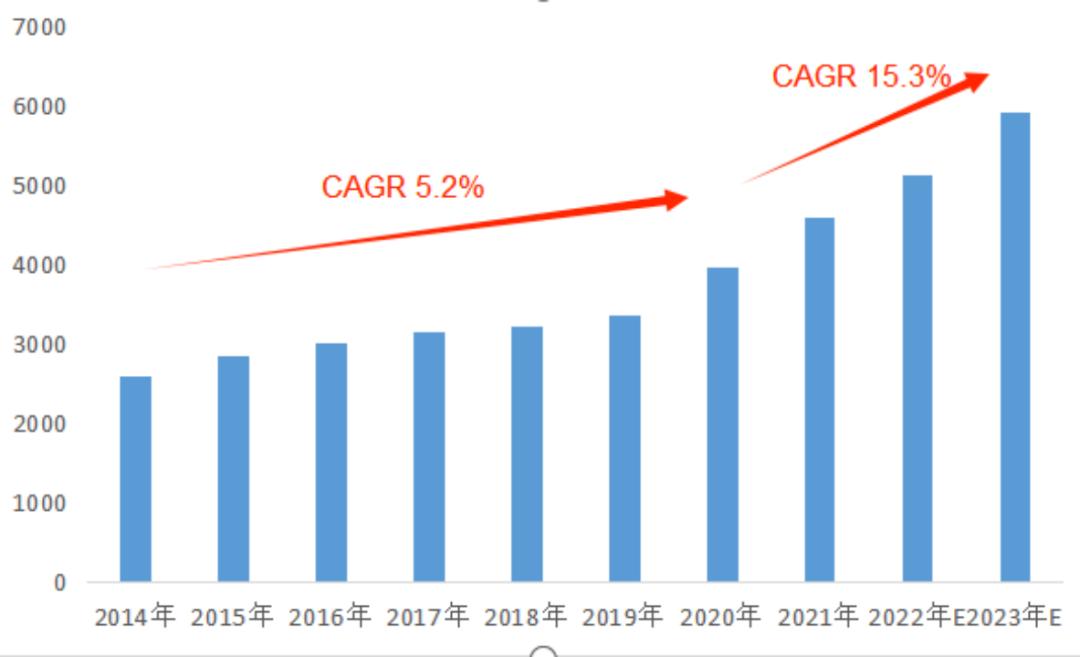 從財務數(shù)據(jù)上來看,海天味業(yè)營收增速回落始于2021年,這其中一個非常重要的背景是國內新冠疫情的持續(xù)。但是從調味品行業(yè)數(shù)據(jù)來看,2020-2022年,我國的調味品行業(yè)規(guī)模其實是處于加速擴張階段的,根據(jù)艾媒咨詢的數(shù)據(jù),在2014-2019年間,我國調味品行業(yè)的CAGR為5.2%,但2020-2022年間的CAGR則上升至15.3.%。