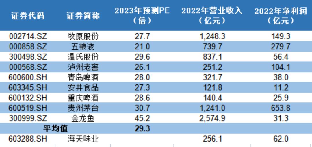 在估值上,我們分別選取調味品行業(yè)中的部分企業(yè)和食品飲料行業(yè)中的部分龍頭企業(yè),根據(jù)wind2023年的一致預期估值,調味品行業(yè)2023年的PE估值為30倍,食品飲料行業(yè)2023年的PE估值為29倍,鑒于此,我們認為海天味業(yè)2023年的PE估值在25-30倍左右較為合理。
