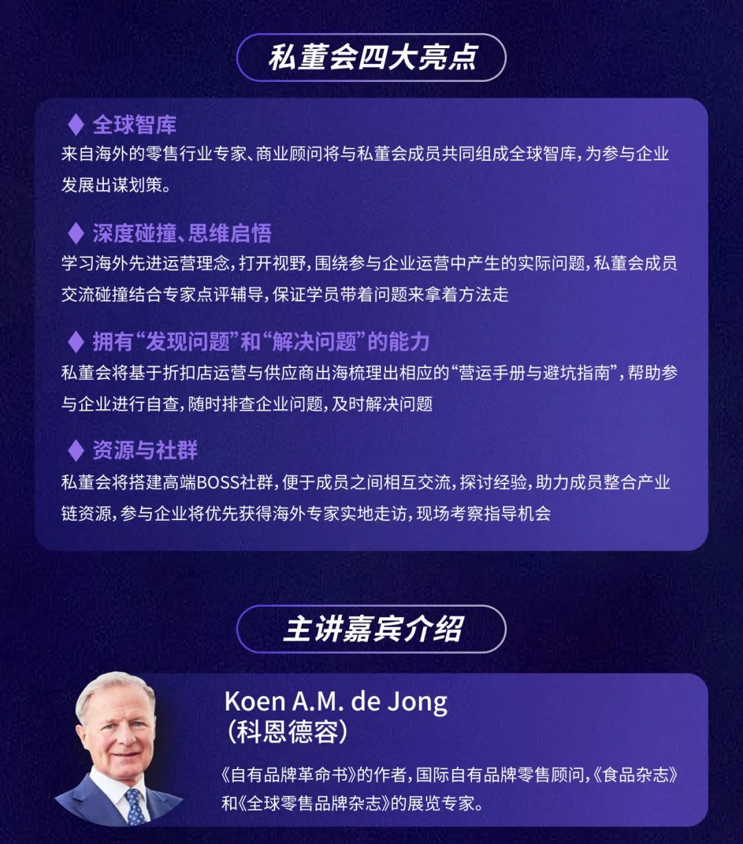 由我愛自有品牌主辦的第一期總裁私享會(huì),特別邀請(qǐng)海外折扣專家Paul Palomba、供應(yīng)鏈專家Koen A.M de Jong,就如何利用自有品牌商品力使零售折扣店突出重圍,如何開拓海外業(yè)務(wù),成為海外零售巨頭供應(yīng)鏈成員等核心環(huán)節(jié)等做深度剖析,為大家展開詳細(xì)的經(jīng)驗(yàn)分享。