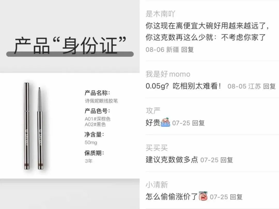 再看最近引發(fā)爭(zhēng)議的國(guó)貨彩妝品牌詩(shī)佩妮推出的眼線(xiàn)膠筆,上新價(jià)19.9元,正式售價(jià)29元。雖然售價(jià)看著低,但已經(jīng)被背刺過(guò)太多回的消費(fèi)者,瞬間就看透了表象下的本質(zhì)——因?yàn)槿萘刻伲挥?.05g。