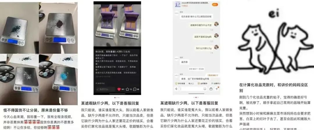 無(wú)獨(dú)有偶,今年5月初,某新銳國(guó)貨美妝品牌的眼影被某博主質(zhì)疑“克數(shù)造假”“短斤缺兩”,雖然該品牌拍攝了涉事產(chǎn)品的凈含量抽檢視頻自證,卻因稱(chēng)重操作不規(guī)范,相關(guān)細(xì)節(jié)缺失等問(wèn)題,再次引發(fā)輿論海嘯;緊接著,另一個(gè)國(guó)貨品牌的遮瑕也被質(zhì)疑克重不足,該品牌客服回應(yīng)“蒸發(fā)所致”,蒼白的解釋并不能讓消費(fèi)者信服。