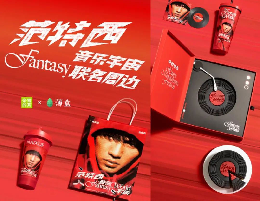 創(chuàng)新的、也是令人瘋狂的是包材和周邊。兩款聯(lián)名奶茶的包裝色彩與圖案就是周杰倫2001年發(fā)布的專輯“范特西”的封面。此外,奈雪還推出一系列這一元素的周邊:聯(lián)名“CD”杯墊,聯(lián)名不銹鋼吸管杯、聯(lián)名“黑膠”月餅禮盒。