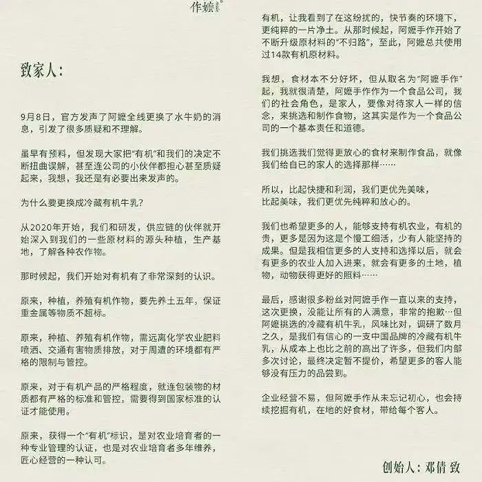 隨后,阿嬤手作創(chuàng)始人鄧倩發(fā)文回應(yīng),一是對(duì)此次更換沒(méi)能讓所有人滿意而感到抱歉,二是表示盡管冷藏有機(jī)牛乳的成本提高了許多,但內(nèi)部多次討論,最終決定暫不提價(jià)。