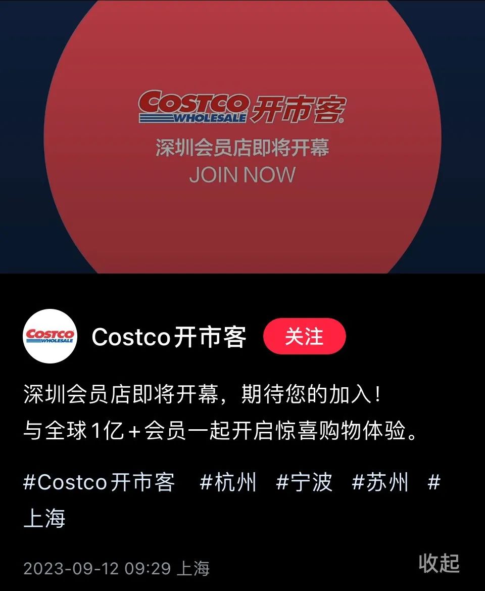小紅書上Costco官微也在9月12日發(fā)布了“深圳會(huì)員店即將開(kāi)幕”的視頻信息,為深圳項(xiàng)目引流。